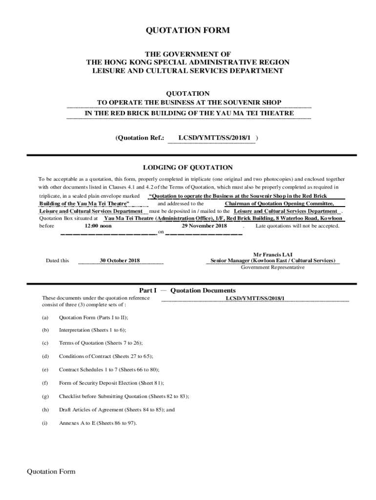 This document serves as a quotation form inviting bids for operating a souvenir shop at the Yau Ma Tei Theatre. It includes the terms, conditions, and requirements for submissions, along with detailed