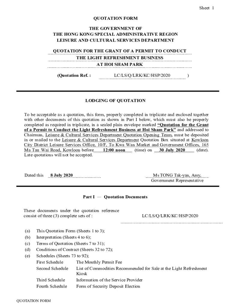 This document serves as a quotation submission form for the permit to operate a light refreshment business at Hoi Sham Park, outlining requirements, terms, conditions, and schedules relating to the
