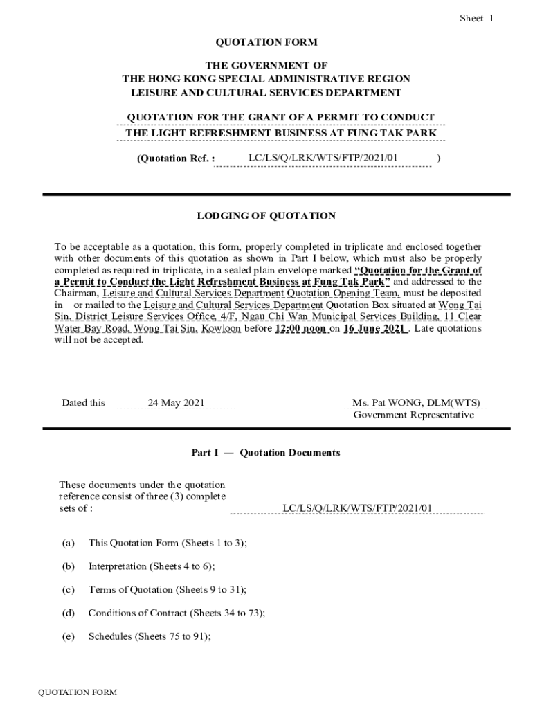 This document serves as a formal quotation request for the permit to conduct the light refreshment business at Fung Tak Park, detailing submission requirements, conditions, and other relevant items.