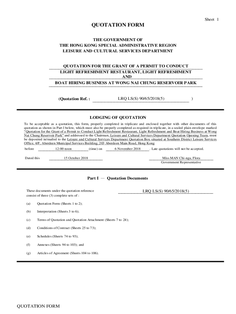 This document serves as a quotation form for the purpose of obtaining a permit to manage a light refreshment restaurant, light refreshments, and boat hiring services at Wong Nai Chung Reservoir Park,