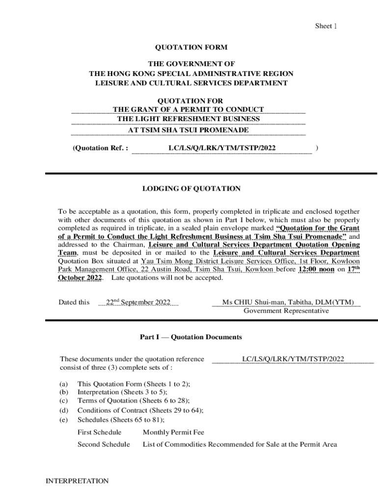 This document outlines the terms and conditions for submitting a quotation to obtain a permit for conducting a light refreshment business at the Tsim Sha Tsui Promenade, as issued by the Leisure and
