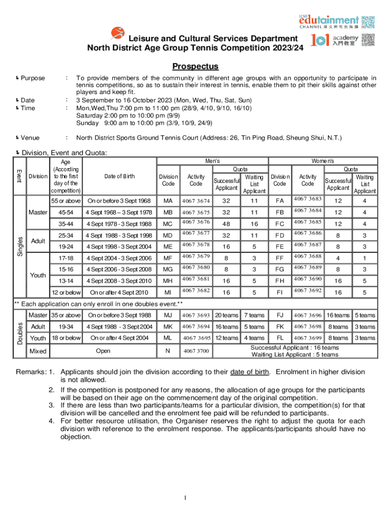本文件的目的是為不同年齡組的社區成員提供參加網球比賽的機會,以保持他們對網球的興趣,並能和其他選手切磋技巧以保持健康。