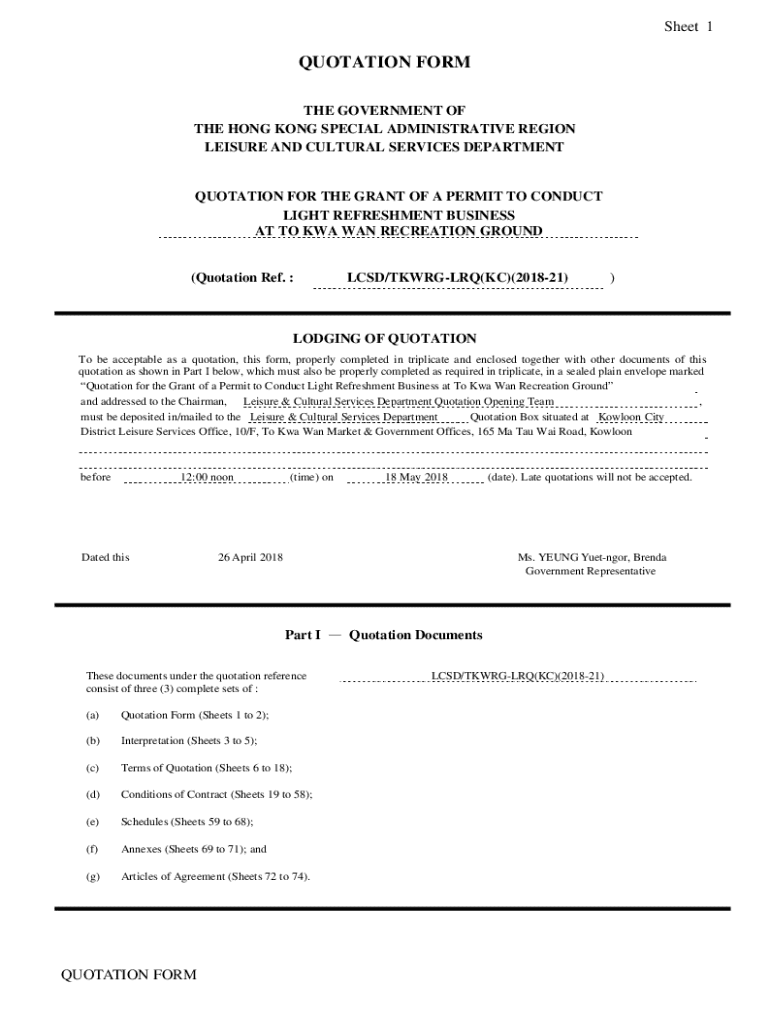 This document serves as a formal quotation form to apply for a permit to carry out light refreshment business at To Kwa Wan Recreation Ground, detailing the submission requirements, terms of quotation,