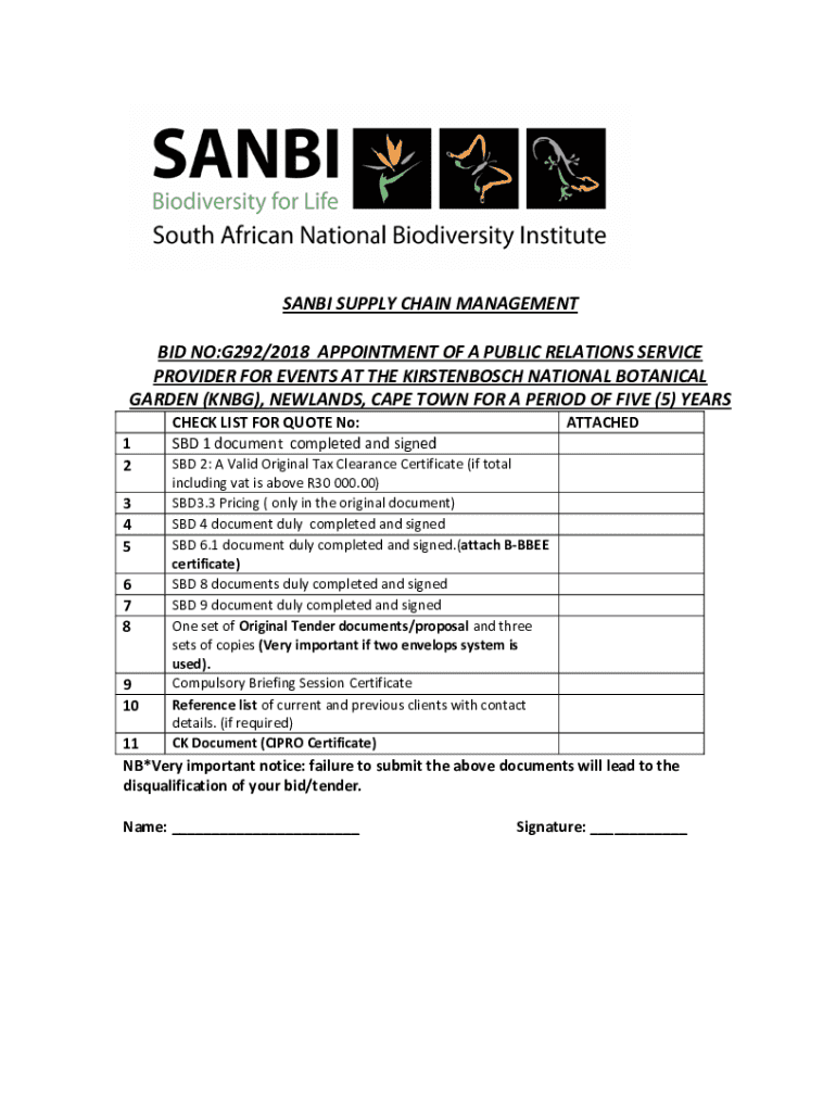 This document serves as a checklist for bidders submitting proposals for a public relations service provider appointment at Kirstenbosch National Botanical Garden, detailing required documents and