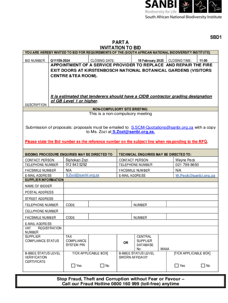 This document serves as an invitation to bid for the tender to replace and repair fire exit doors at Kirstenbosch National Botanical Gardens. It includes details about the bidding process, eligibility,