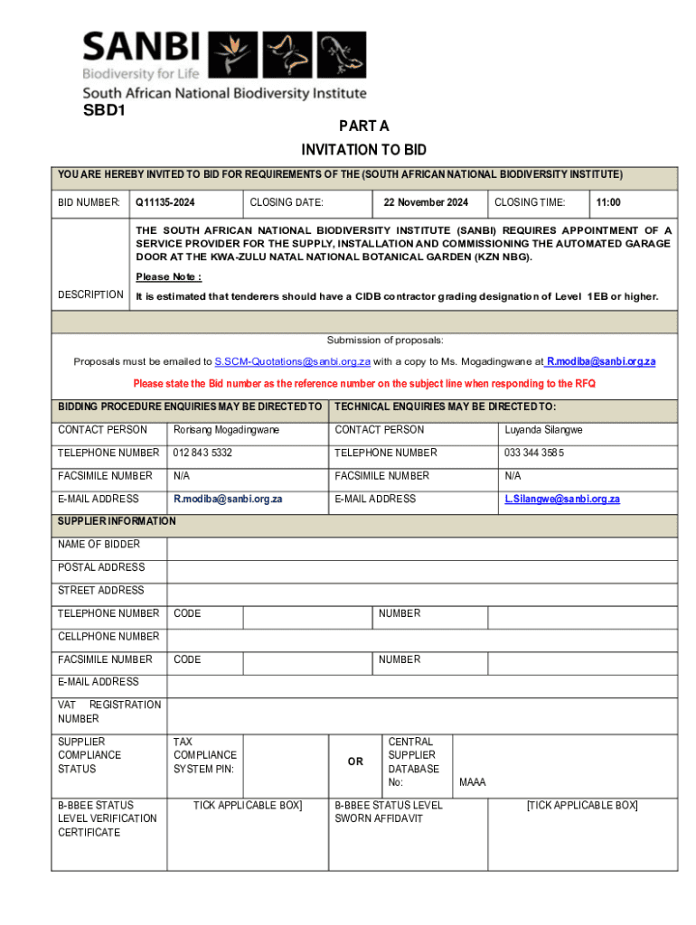 This document invites bidders to submit proposals for the supply, installation, and commissioning of an automated garage door at the Kwa-Zulu Natal National Botanical Garden. It outlines the bidding