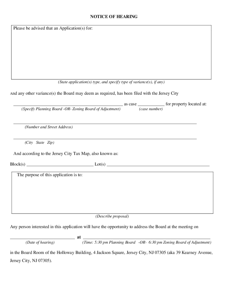 This document informs interested parties about an application filed for a variance with the Jersey City Board and provides details for addressing the Board at an upcoming meeting.