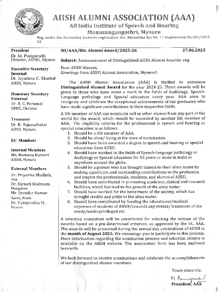 The document announces the Distinguished Alumni Award for the year 2024-25 by the AIISH Alumni Association, detailing nomination criteria, eligibility requirements, and the selection process.
