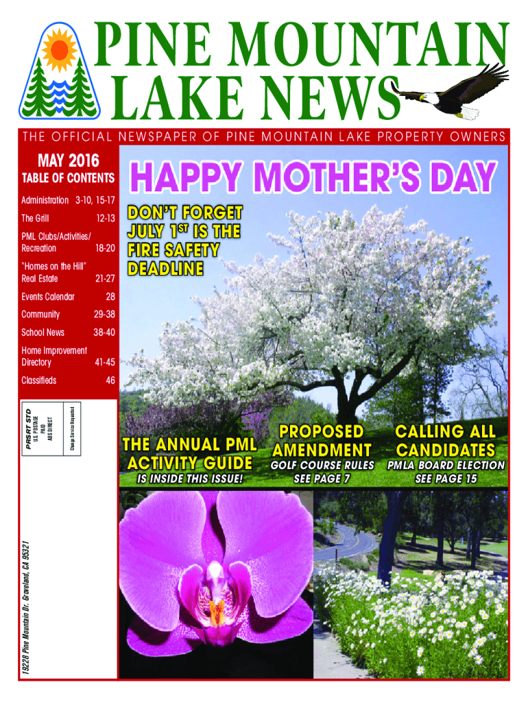 The official monthly newspaper for the Pine Mountain Lake Property Owners, featuring community news, events, advertisements, and more.
