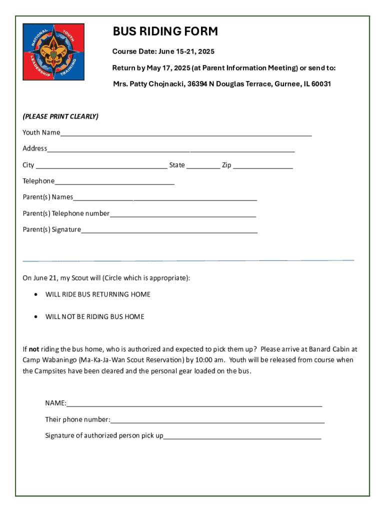 This form is used to register Scouts for bus transportation returning home from a course at Camp Wabaningo, including parent and authorized pickup information.
