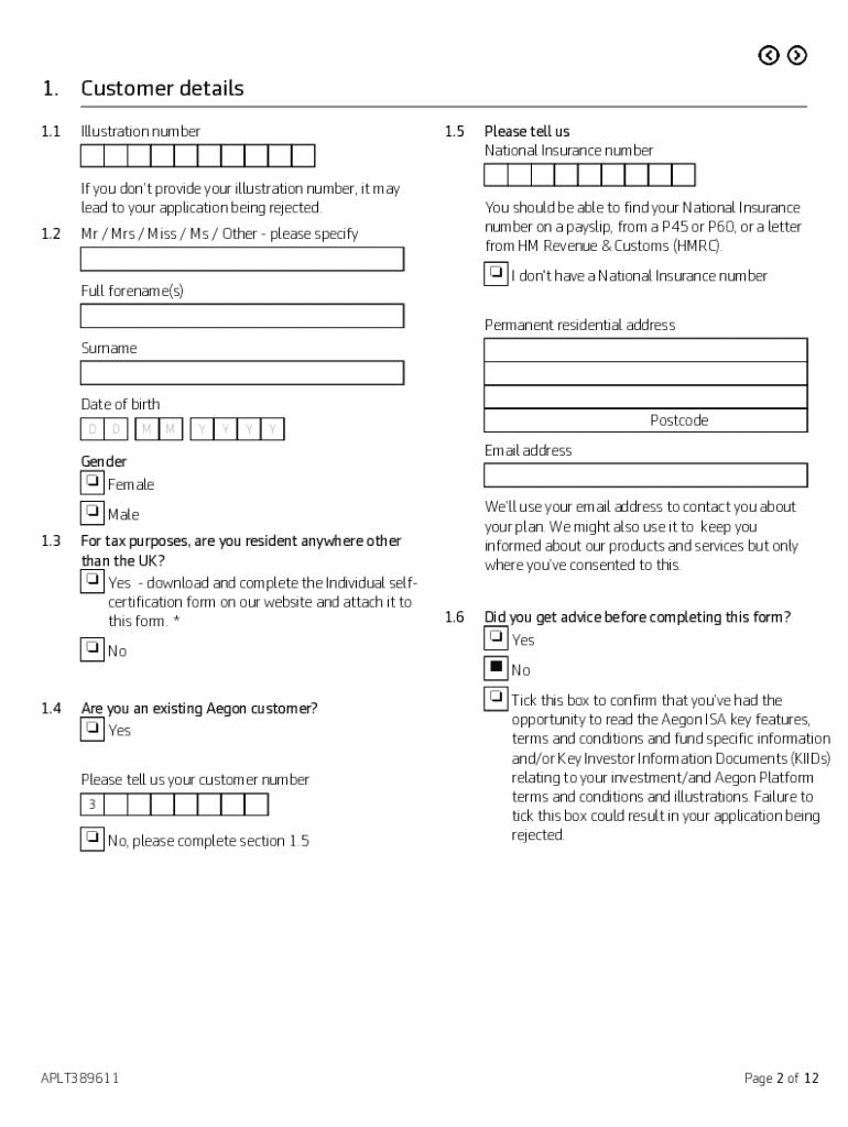 The Aegon ISA application form requires reporting personal identification details, contact information, financial status, and investment preferences.
