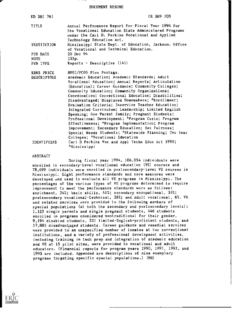 Get the free Annual Performance Report for Fiscal Year 1994 for the Vocational Education State Ad...