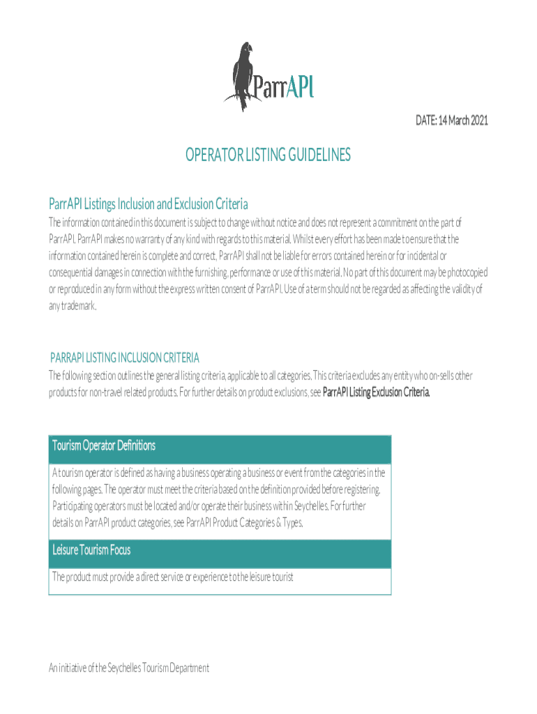 This document outlines the inclusion and exclusion criteria for listings on ParrAPI, focusing on tourism operators, product categories, and the requirements for eligible listings in Seychelles.