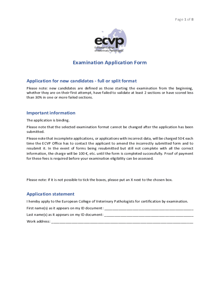 This document serves as an application form for new candidates seeking certification by examination from the European College of Veterinary Pathologists (ECVP). It outlines requirements for applications,