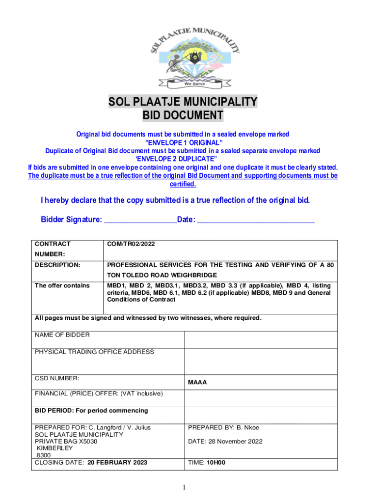 Sol Plaatje Municipality Bid is not the form you're looking for?Search for another form here.