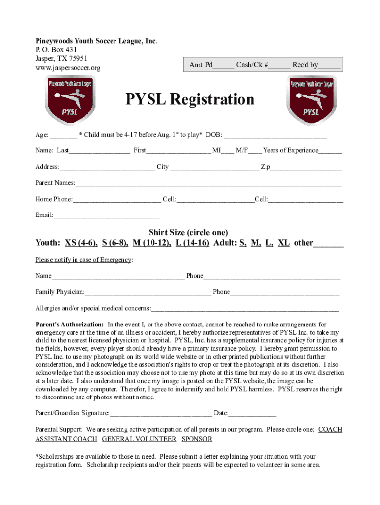 The pysl registration form serves a vital purpose, acting as the gateway for users—be it individuals or teams—to access specific services or register for events. Its main role lies in collecting essential data required for identification and operational processes. Particularly in sectors like education, sports, or corporate environments, this form is pivotal in establishing communication channels and organizing participant information effectively.