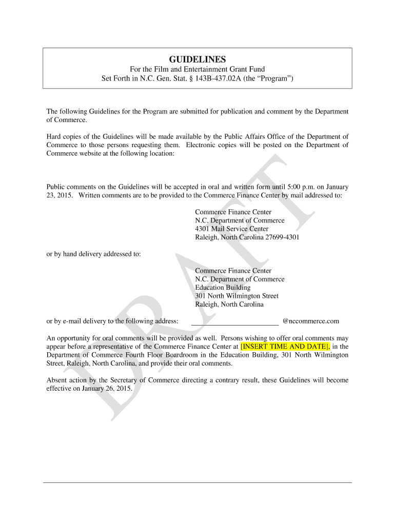 GUIDELINES For the Film and Entertainment Grant Fund Set Forth in N.C. Gen. Stat. 143B437.02A (the Program)The following Guidelines for the Program are submitted for publication and comment by the