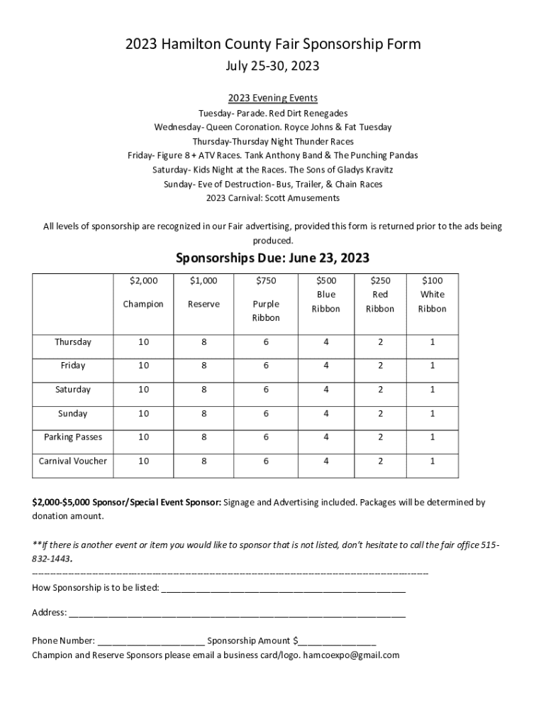 Get the free 2023 Hamilton County Fair Sponsorship Form
