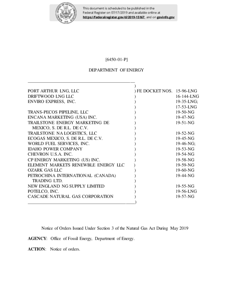This document provides notice of orders issued by the Department of Energy granting authority for the import and export of natural gas and liquefied natural gas during May 2019.