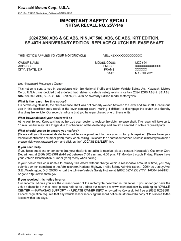 This document informs owners of certain 2024 Kawasaki motorcycles about a safety recall related to a defect in the clutch release shaft that may affect vehicle operation.