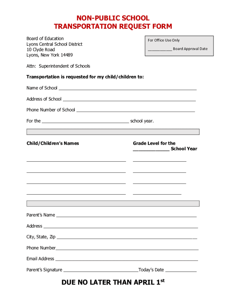 The non-public school transportation request form is an essential document for families whose children attend non-public or private schools. Utilizing this form allows parents and guardians to formally request transportation services, ensuring their children have access to reliable and safe transportation. Completing this form correctly is vital to meet school district requirements and guarantee that the transportation needs of students are addressed effectively.