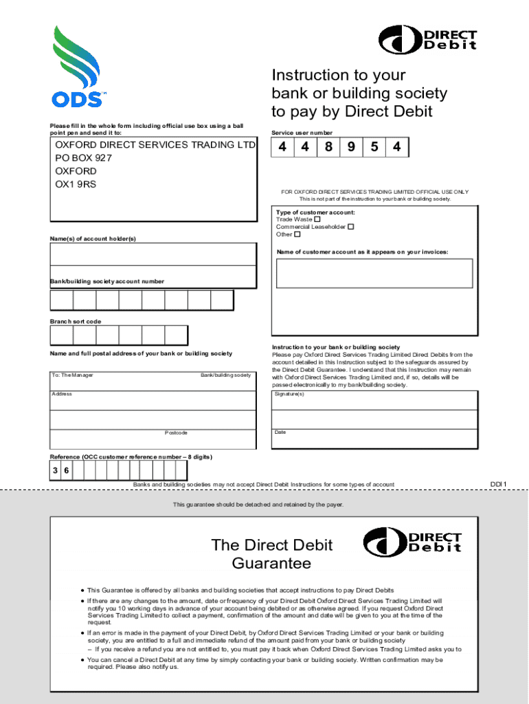 This document serves as a Direct Debit Instruction form for customers wishing to set up a Direct Debit payment to Oxford Direct Services Trading Limited for services such as Trade Waste or Commercial