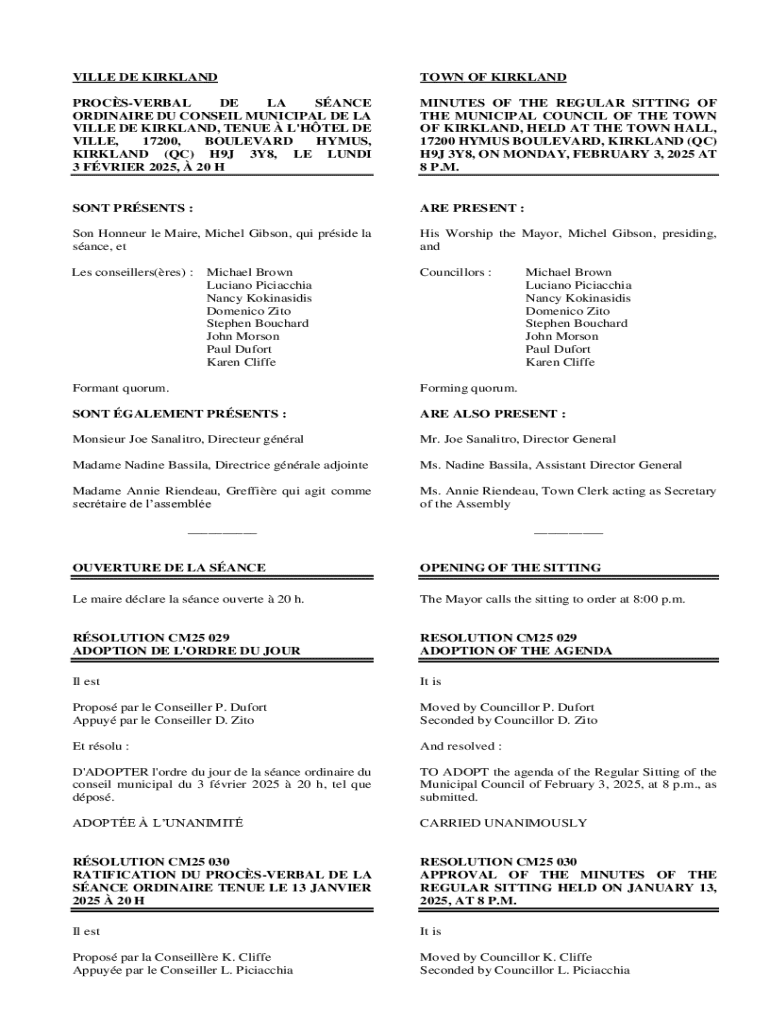 Ce document contient les minutes de la séance ordinaire du conseil municipal de la Ville de Kirkland, incluant les résolutions adoptées et les participations des membres présents.