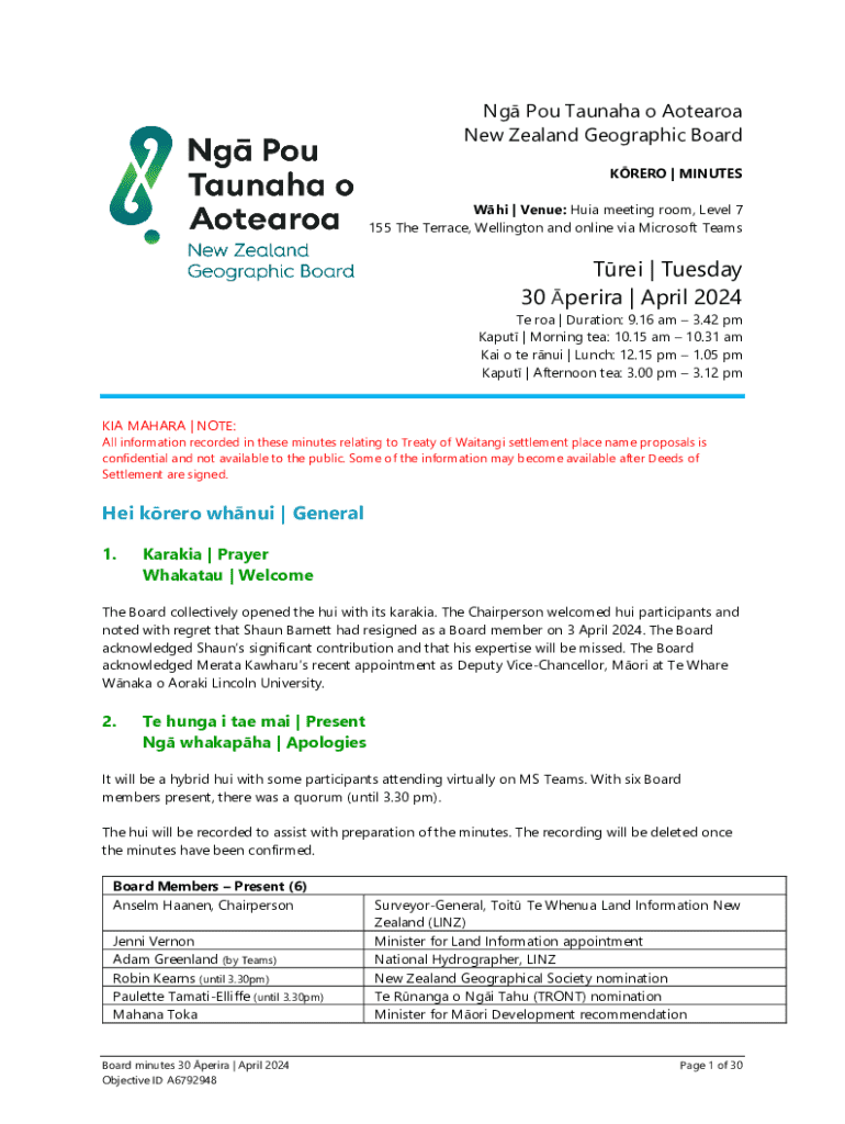 This document contains the minutes of the Board meeting of Ngā Pou Taunaha o Aotearoa, detailing various discussions, decisions made regarding place names in New Zealand, and other matters of significance