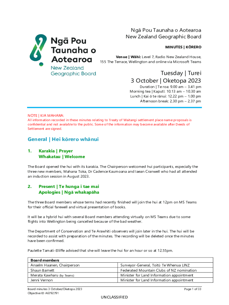 This document contains the minutes of a meeting held by the New Zealand Geographic Board, detailing discussions on place names, proposals, and other governance matters.