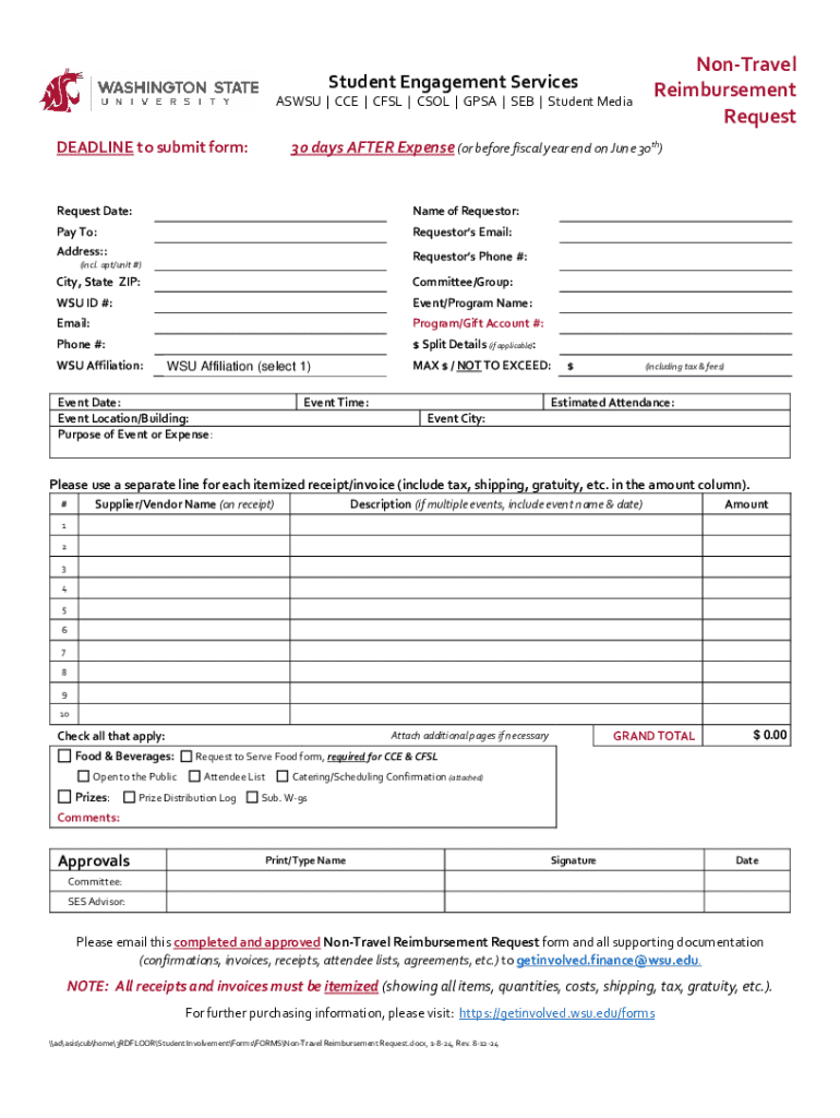 When completing a non-travel reimbursement request form, certain key components must be included to ensure a smooth and efficient processing of the request. Essential information typically encompasses the requestor’s details, including name, contact information, and employee ID. Moreover, it is crucial to provide an itemized list of all expenses incurred and the reason behind each expense. This allows for a clearer understanding of the costs involved.