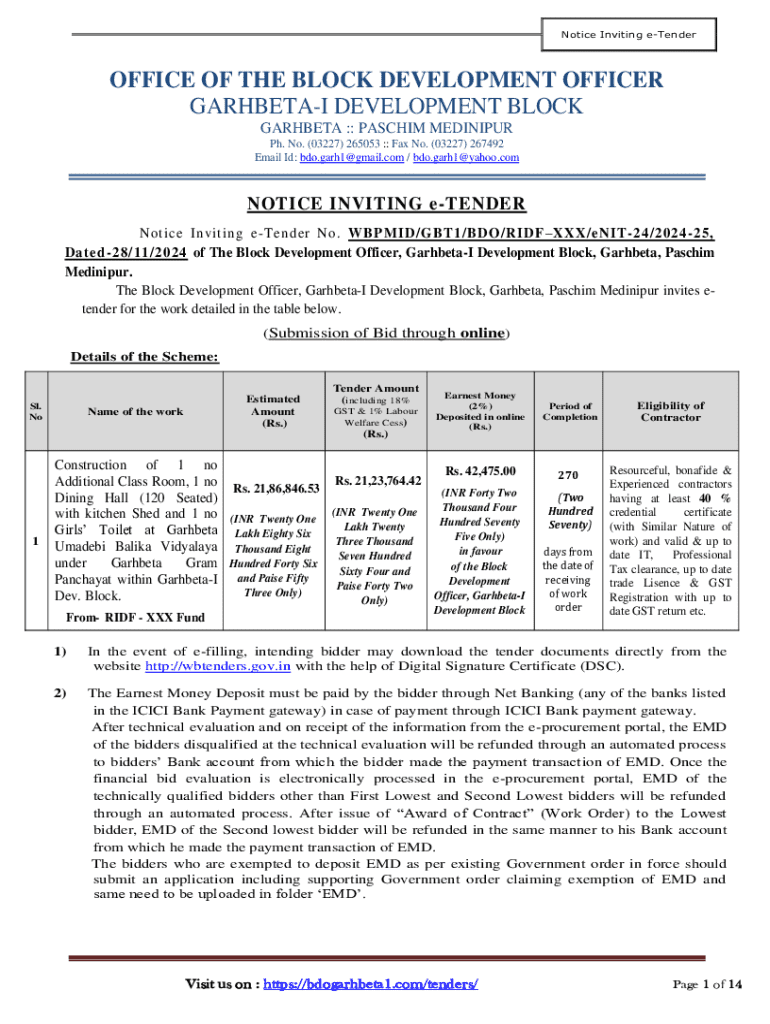 This document is a notice inviting e-tender for construction work of a class room, dining hall, and girls\' toilet under the Garhbeta-I Development Block, outlining the eligibility criteria, bidding