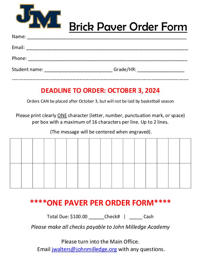 This document is used to place an order for a brick paver with specific customization options. It includes fields for personal information and payment details.
