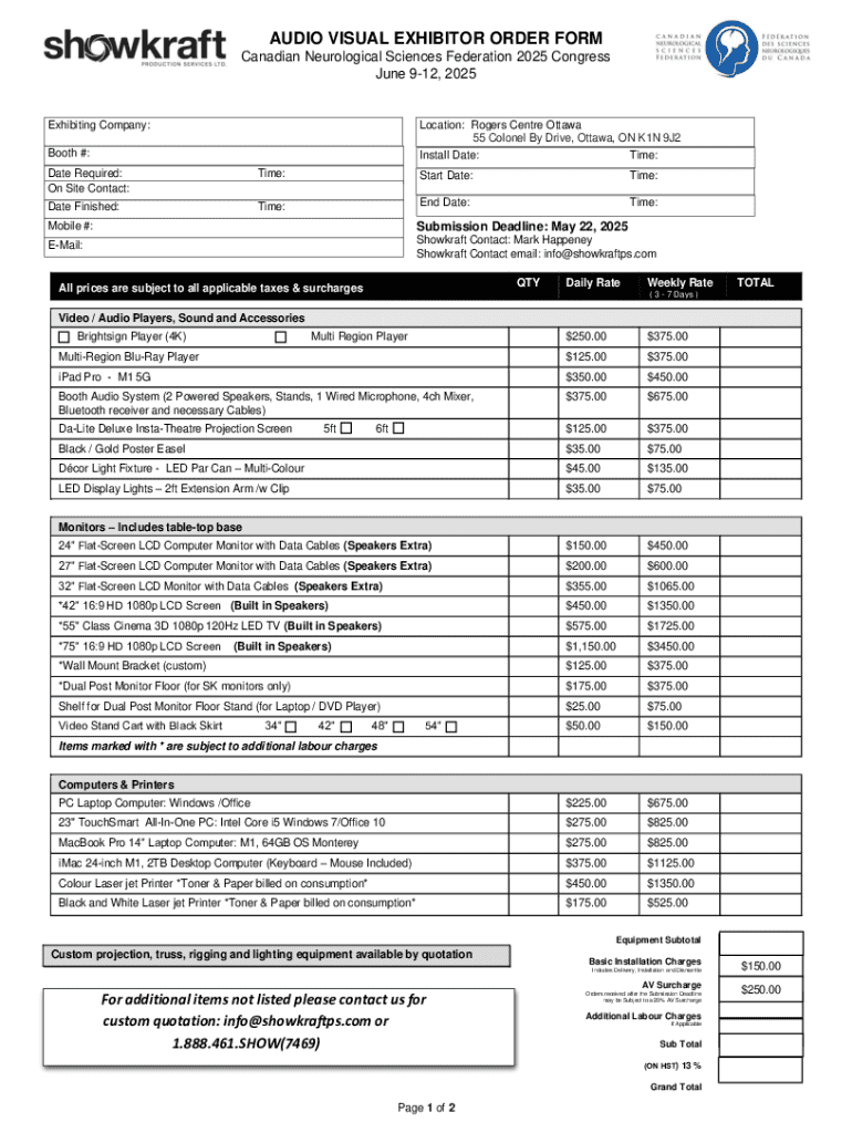 This form is for exhibitors to order audio visual equipment for the Canadian Neurological Sciences Federation 2025 Congress, including pricing, installation details, and payment information.