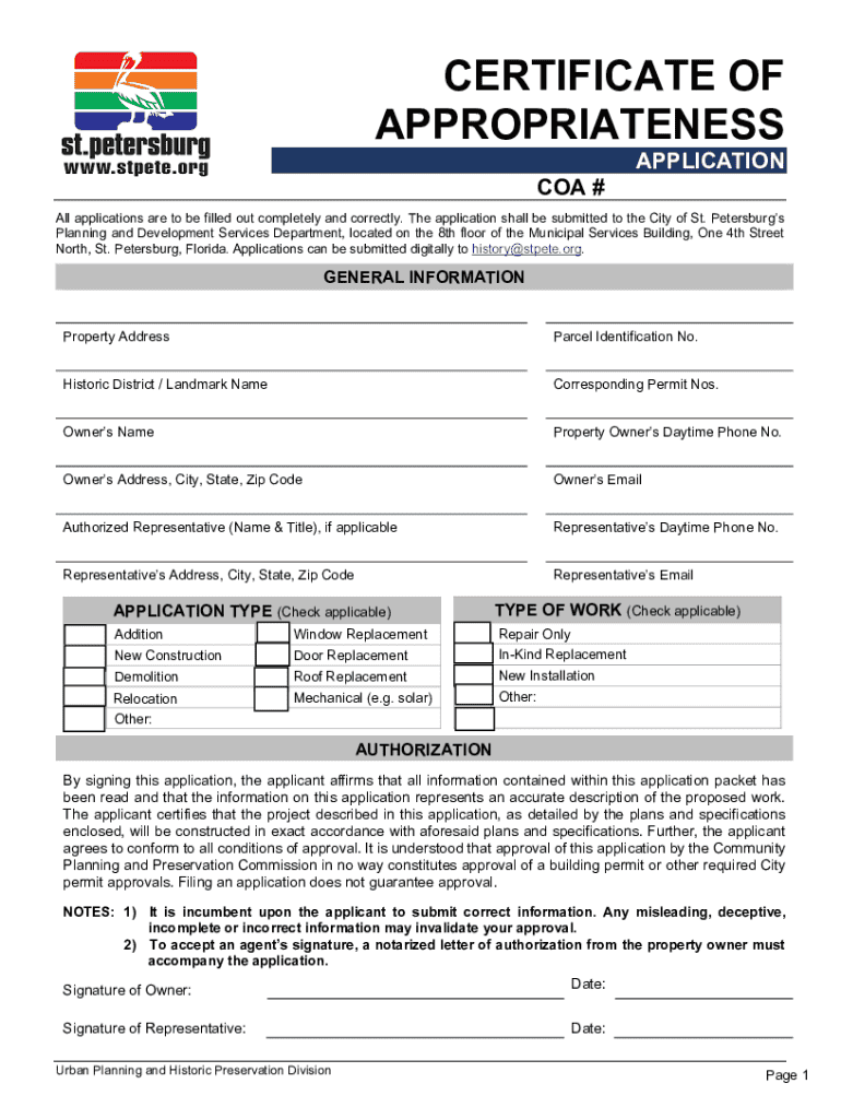 This document serves as a resource guide for application for a Certificate of Appropriateness in St. Petersburg, Florida, detailing requirements, procedures, and compliance standards for exterior