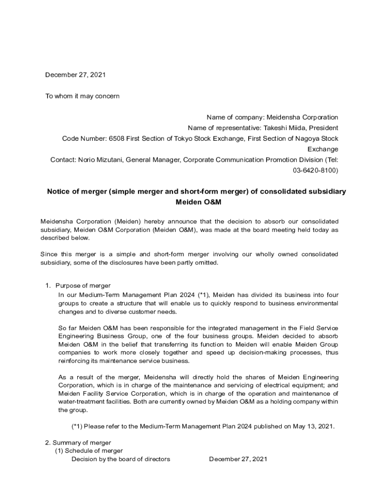 Get the free Notice of merger (simple merger and short-form ...