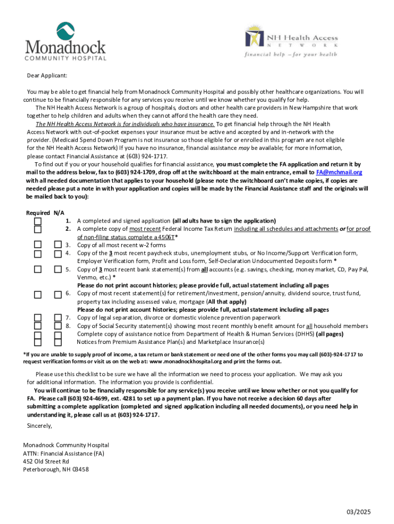 This document outlines the process for individuals seeking financial assistance for healthcare services at Monadnock Community Hospital. It includes information on eligibility criteria, required documentation,