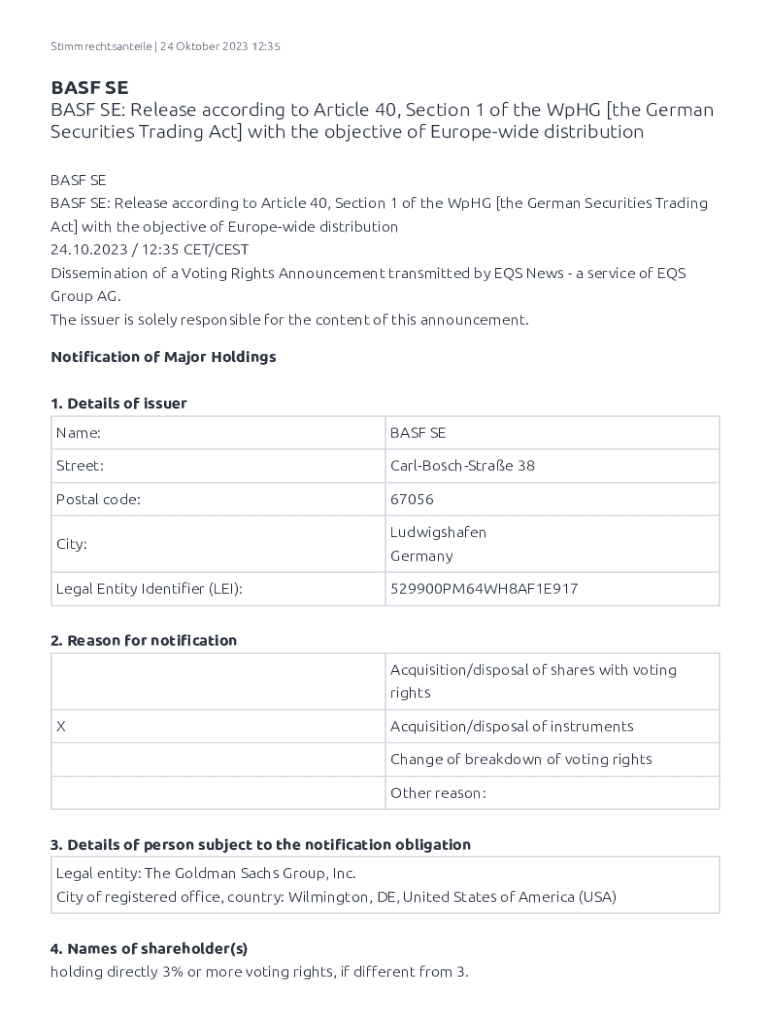 This document is a notification of major holdings by The Goldman Sachs Group, Inc. regarding voting rights in BASF SE, under the German Securities Trading Act (WpHG). It includes details on share