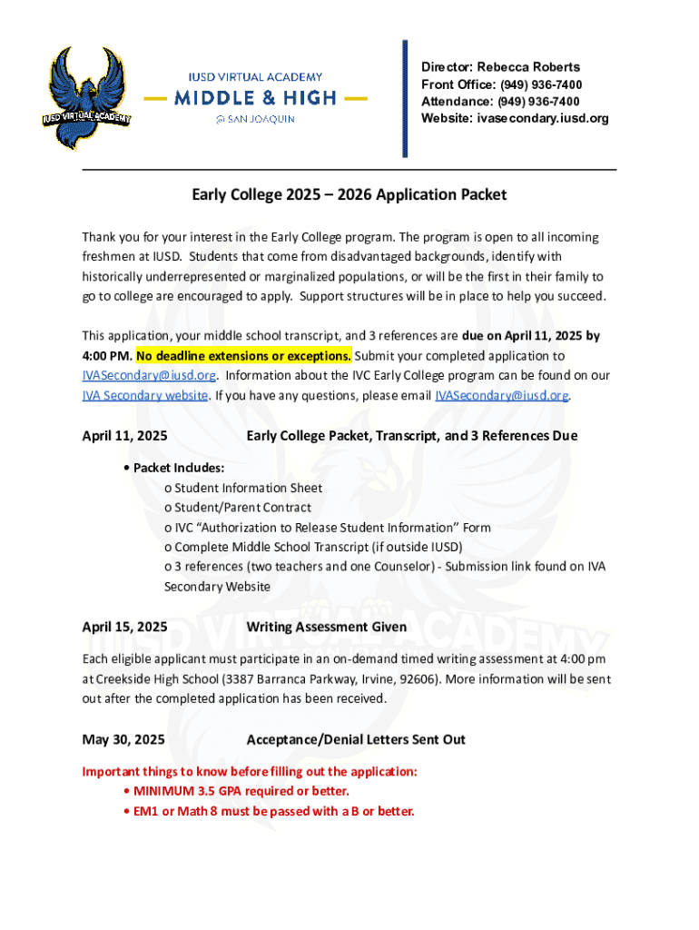 The Early College 2 form marks an essential milestone for students considering this educational opportunity. Key deadlines typically include application windows, interviews, and notification dates which are crucial for prospective students. Understanding these timelines ensures applicants are well-prepared and can submit their forms on time.