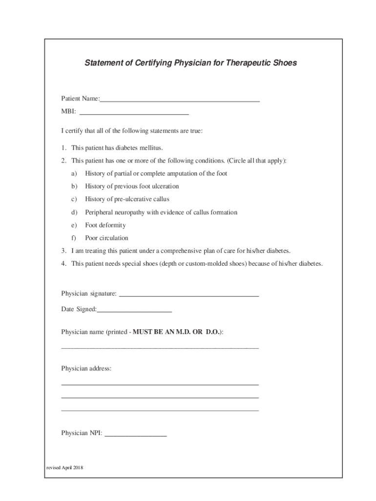 Statement of Certifying Physician for Therapeutic Shoes 2018-2026 free printable template