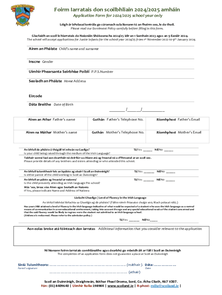 The foirm iarratais don scoilbhliain, or school enrollment application form, is a crucial document that parents or guardians must fill out to enroll their children in educational institutions. This form serves as an official request for admission into a school, providing essential details that schools review to assess eligibility and capacity. Therefore, understanding the significance of this application form is imperative.