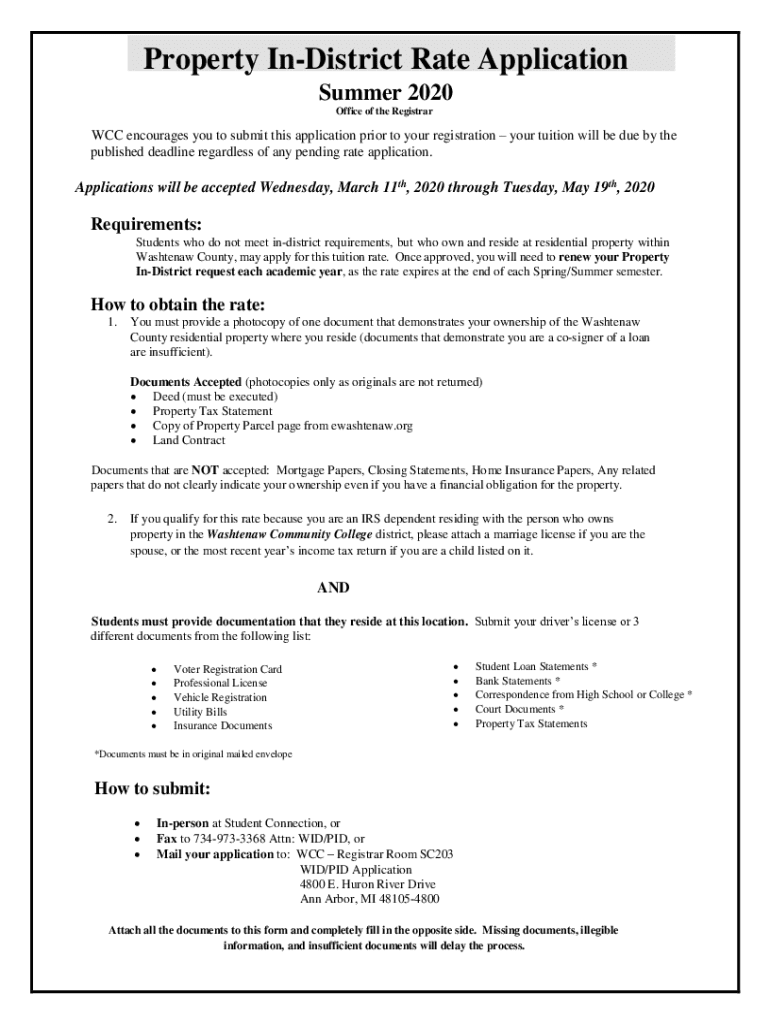 This document is an application for students who own and reside at property within Washtenaw County to apply for a discounted tuition rate at Washtenaw Community College. It outlines the requirements,