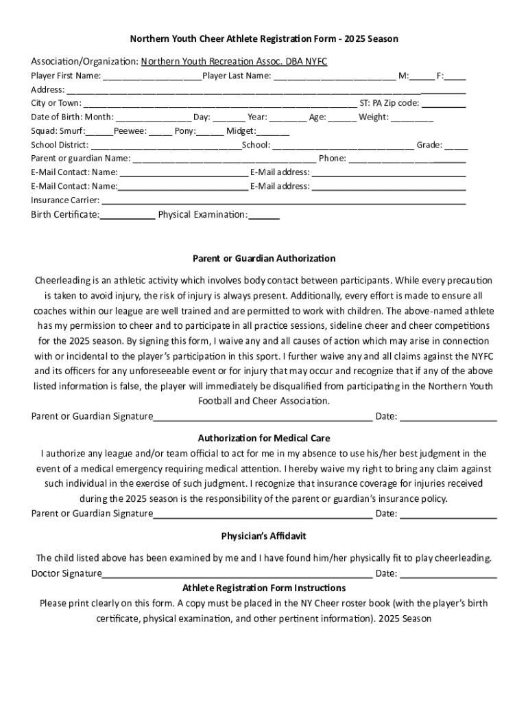 Get the free Northern Youth Cheer Athlete Registration Form - 2025 Season
