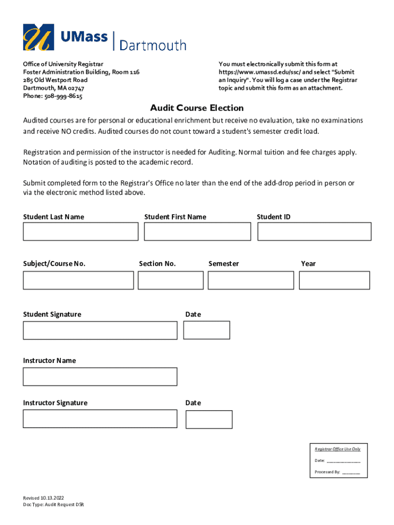 Many students have questions regarding the audit process, especially concerning the responsibilities that accompany this type of enrollment. A common question is how one can audit a course. Generally, this process involves completing the Audit Course Election Form, selecting the preferred course, and adhering to submission deadlines. Additionally, students often inquire about their financial obligations; do they need to pay student fees as an audit student? The answer usually varies by institution, but it's critical to seek clarity beforehand.