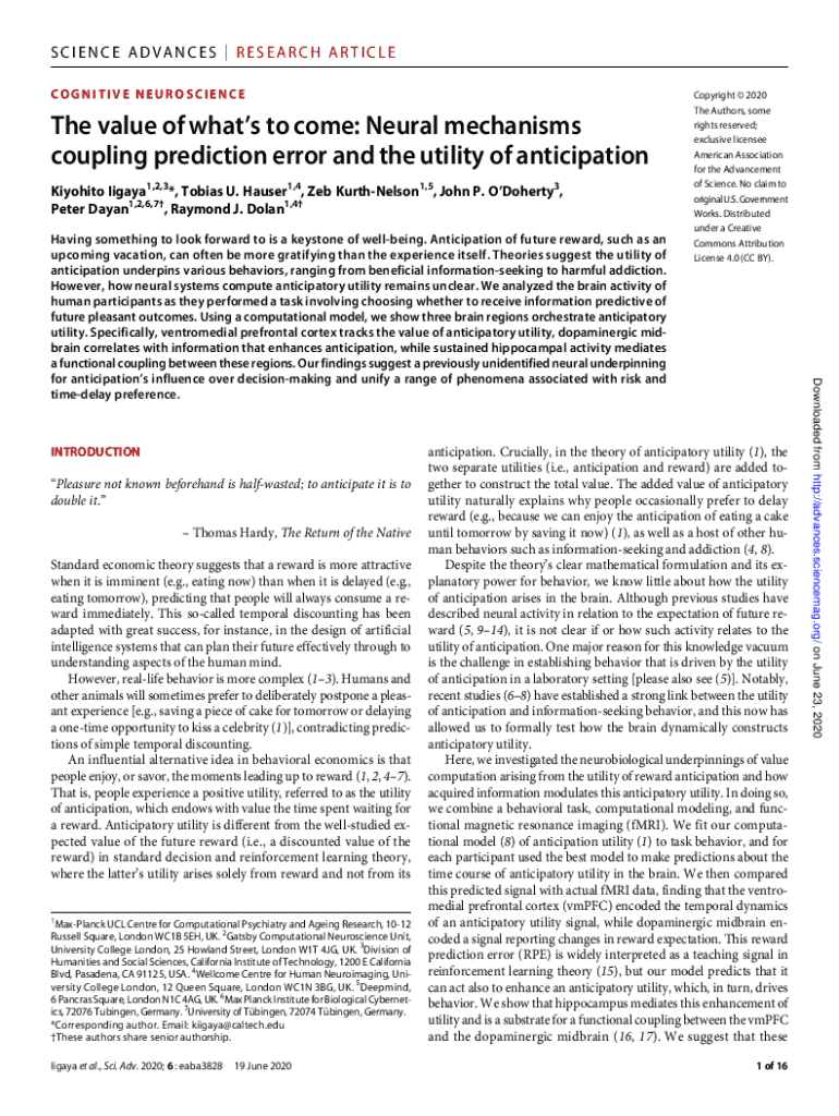 SCIENCE ADVANCES | RESEARCH ARTICLE COGNITIVE NEUROSCIENCEThe value of whats to come: Neural mechanisms coupling prediction error and the utility of anticipation Kiyohito Iigaya1,2,3*, Tobias U. Hauser1,4,