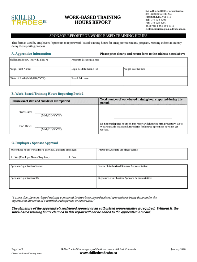 This form is used by employers/sponsors to report work-based training hours for an apprentice in any program. It includes sections for apprentice information, training hours reporting period, and