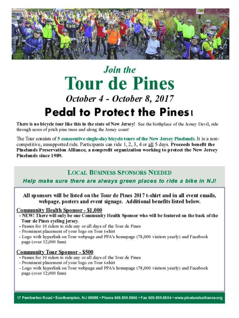 The Tour de Pines 2017 form serves as the main registration document for the event. This form is crucial for both individual participants and teams, as it collects vital information needed for registration, assignments, and logistical planning. Filling out this form correctly ensures a smooth onboarding process for all involved.