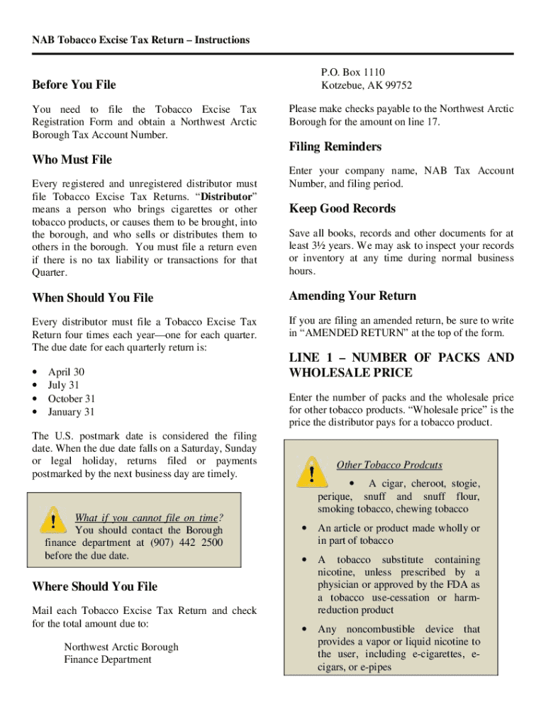 Get the free Nab Tobacco Excise Tax Return – Instructions