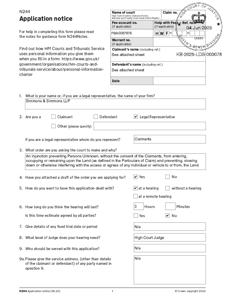 Form N244 is an essential legal document used within the United Kingdom to apply for certain court orders. Specifically, it serves the purpose of allowing individuals to set aside or vary a County Court Judgment (CCJ) that may have been issued against them. Utilizing Form N244 correctly is crucial as it affects your legal standing and financial future. Errors in this form could lead to continued enforcement of the CCJ or other legal repercussions.
