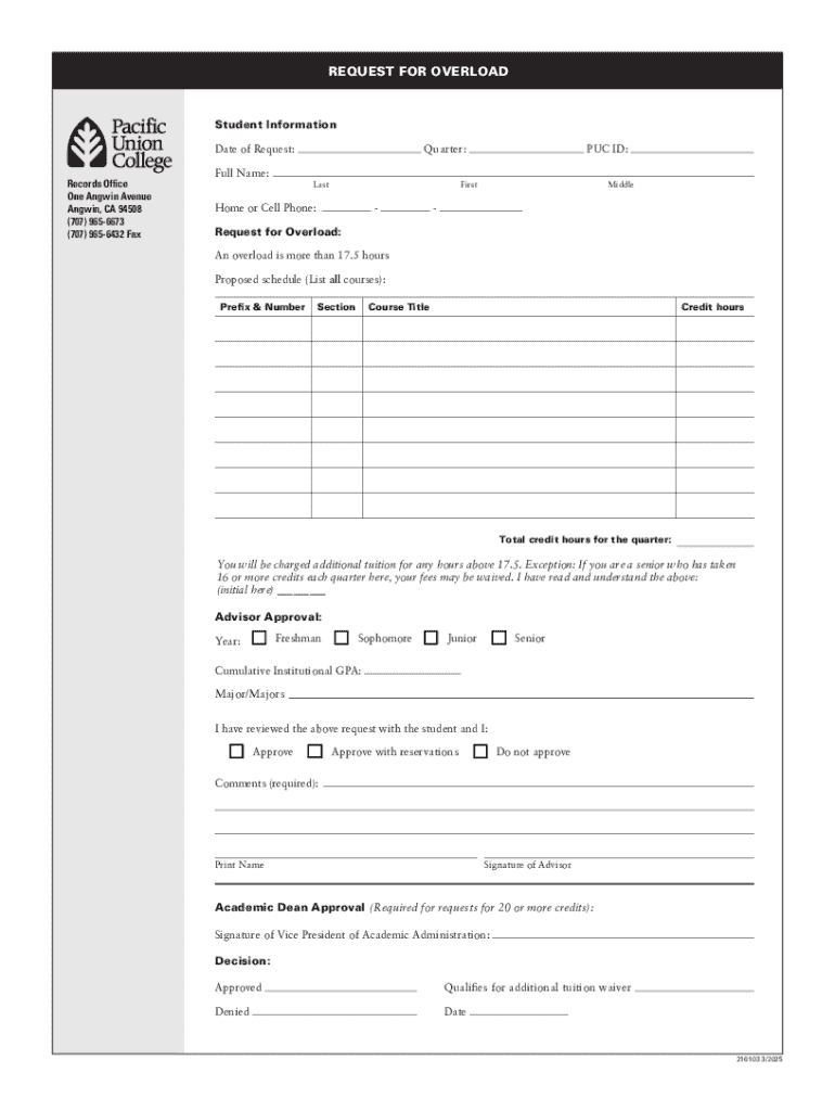 An overload form is a critical document that allows students to request permission to enroll in more courses than their institution typically permits. The purpose of this form is to manage course loads and ensure students can maintain their academic performance while engaging in a heavier workload. Understanding this form's significance is essential for students who wish to balance ambitious academic pursuits with their other commitments.