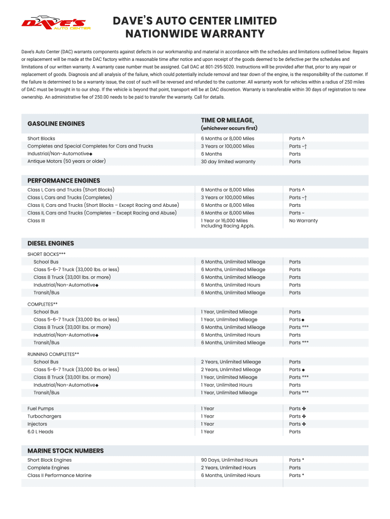 Get the free Dave’s Auto Center Limited Nationwide Warranty